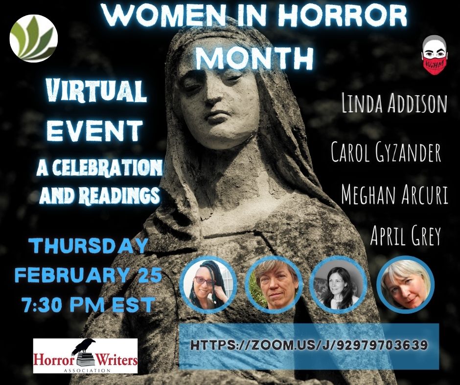 Another celebration of Women in Horror Month! This time, Jessikah Chautin of the Syosset Public Library has asked Linda Addison, Carol Gyzander, April Grey, and me to join her for an evening of readings, Q&A, and fun.