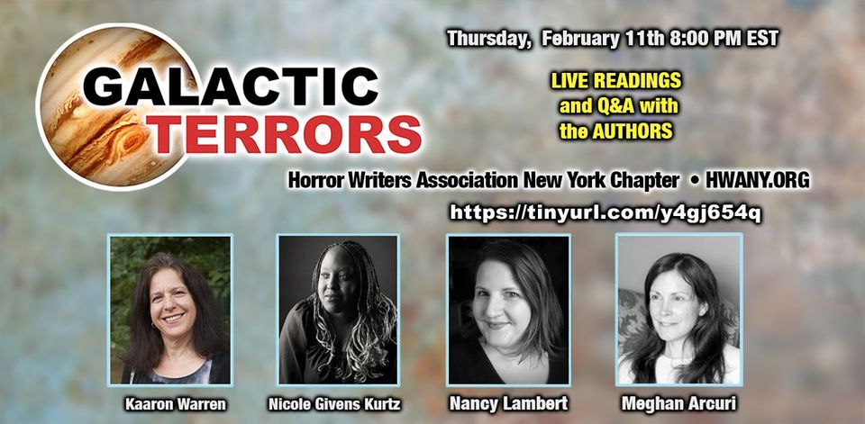 In celebration of Women in Horror Month, Jim Chambers and Carol Gyzander (of HWA-NY) have asked me to join Kaaron Warren, Nicole Givens Kurtz, and Nancy Lambert to be part of their Galactic Terrors reading series.